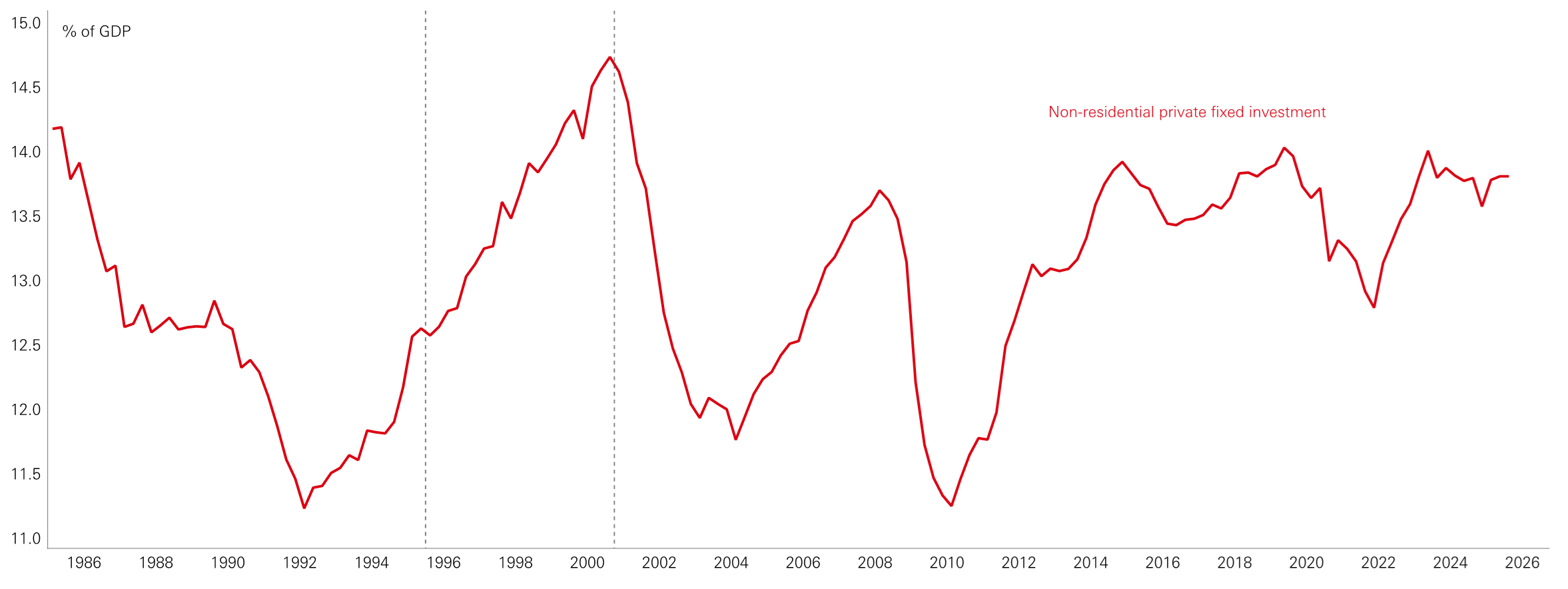 The late-1990s dotcom period provides a potentially useful historical precedent for today’s AI investment cycle. Then, a multi-year investment surge lifted the investment-to-GDP ratio by approximately 2 per cent, following a period of subdued capex. The present cycle appears similar in scale, although the early phase has unfolded faster. History suggests that such booms tend to run for several years rather than one or two, and that they often end with some degree of retrenchment once overcapacity becomes apparent. At this stage, however, available data point to an ongoing boom rather than an imminent reversal.