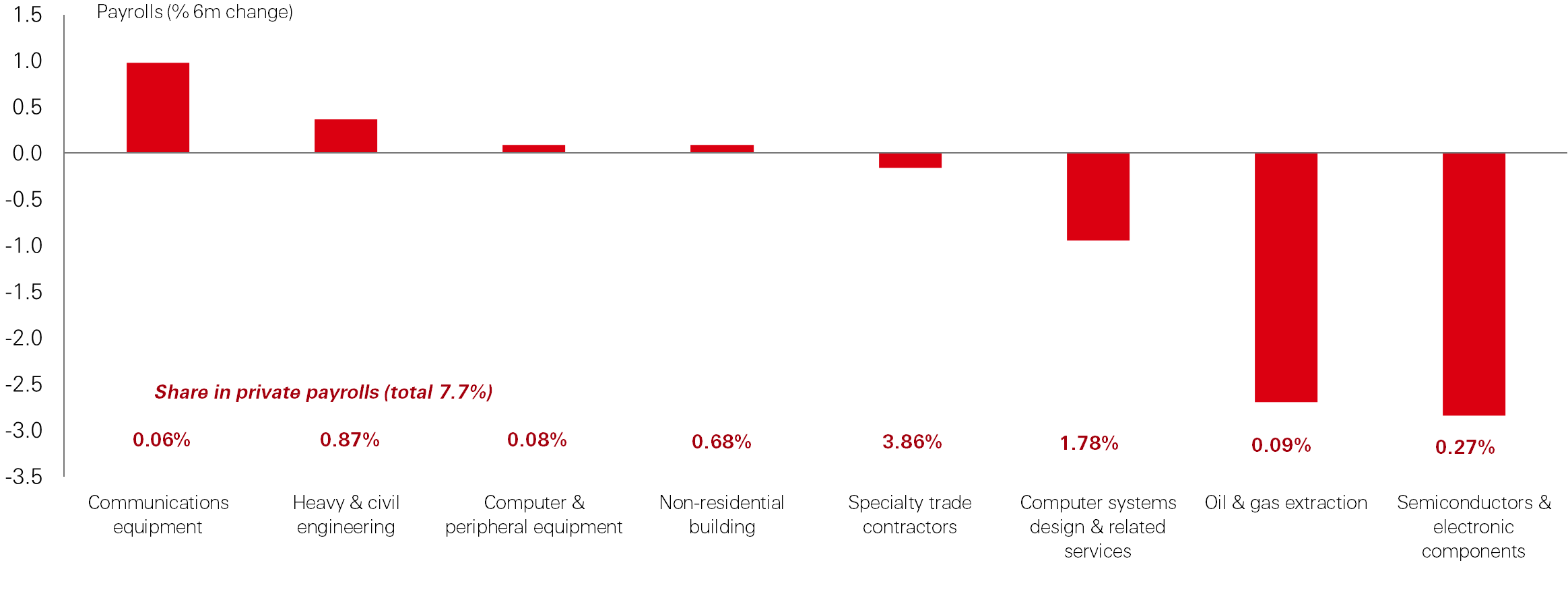 Sectors linked to data-centre construction – communications equipment, heavy civil engineering, computer and peripheral equipment, and non-residential building – account for around 7.7 per cent of private payrolls. While keeping in mind that much of the employment in these sector will not be impacted by tech capex, it is noteworthy that employment growth in these categories has been limited. This highlights how capital-intensive the AI build-out is: it requires substantial spending, but the direct employment footprint is narrow.