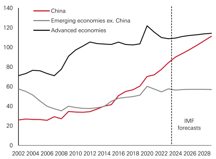 The secular trend of rising US debt, which is nearing World War II highs, is mainly driven by entitlement spending and net interest payments. The resulting wide fiscal deficit is an important driver of the current account imbalance, which has led to current trade tensions, especially with China.