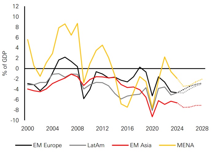 In general, Emerging Markets have shown fiscal discipline in recent years and particularly post-pandemic, contributing to stable public debt. Lower primary deficits in EM countries are expected to persist, contrasting with Developed Markets, where interest liabilities have increased leading to higher debt burdens. Again, the picture is geographically nuanced, with EM regions such as Central America, the Caribbean, frontier economies, and hydrocarbon exporters demonstrating fiscal discipline, while deterioration is evident in Central and Eastern Europe (CEE), China, Mexico, and Brazil.