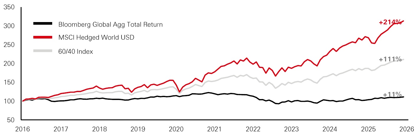 1. Source: HSBC Alternative Investments Limited, Bloomberg. As at January 2026. Performance period February 2016 – January 2026. 60/40 Index is represented by 60 per cent allocation to MSCI Hedged World USD & 40 per cent allocation to Bloomberg Global Aggregate Total Return Index.