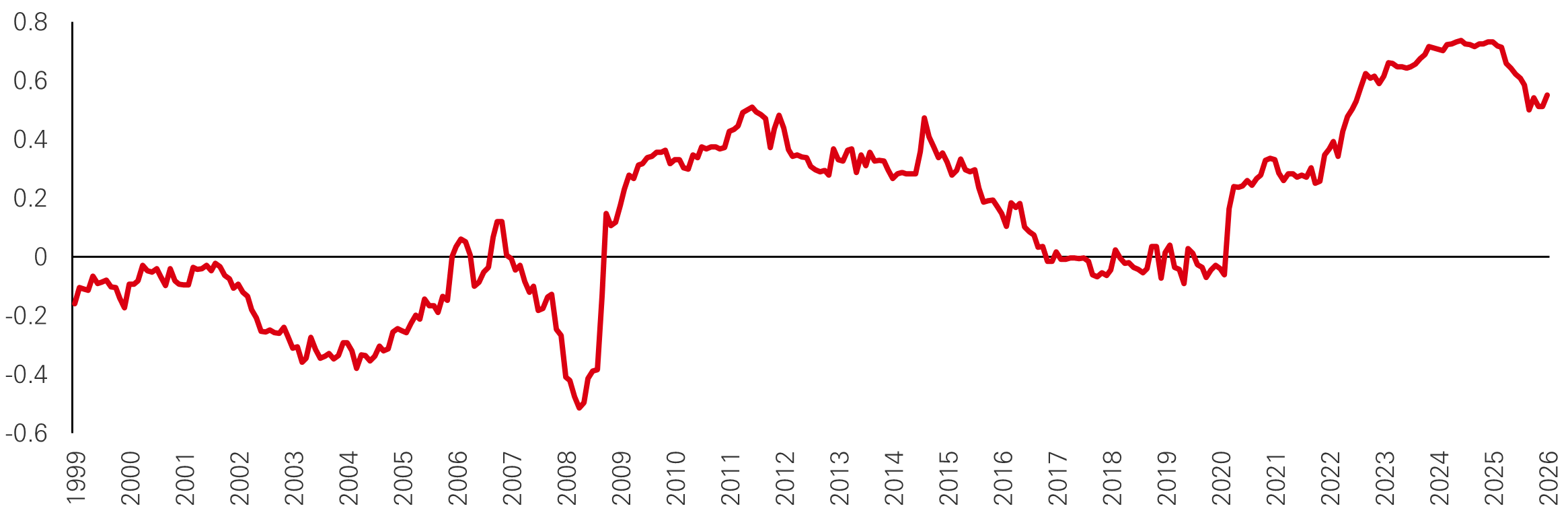 2. HSBC Alternative Investments Limited, Bloomberg. As at January 2026. 3 year rolling correlation between the MSCI Hedged World USD Index and the Bloomberg Global Aggregate Total Return Index for the period May 1996 to January 2026.