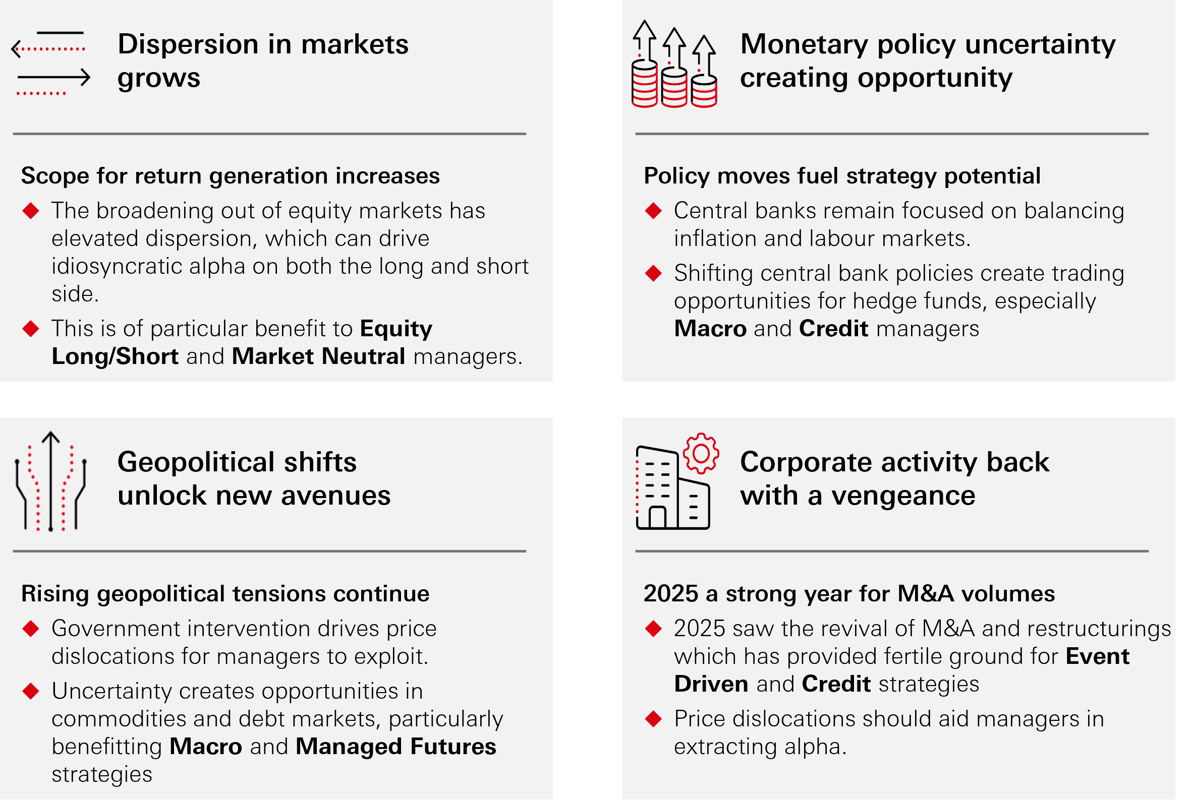 3. & 4. & 5. Source: HSBC Alternative Investments Limited, Bloomberg, HFRI Inc. As at January 2026. Performance period February 2016 to January 2026 of the HFRI FWI is the HFRI Fund Weighted Index and the Bloomberg Global Aggregate Total Return Index. There is no guarantee the trend illustrated by the charts above will continue.