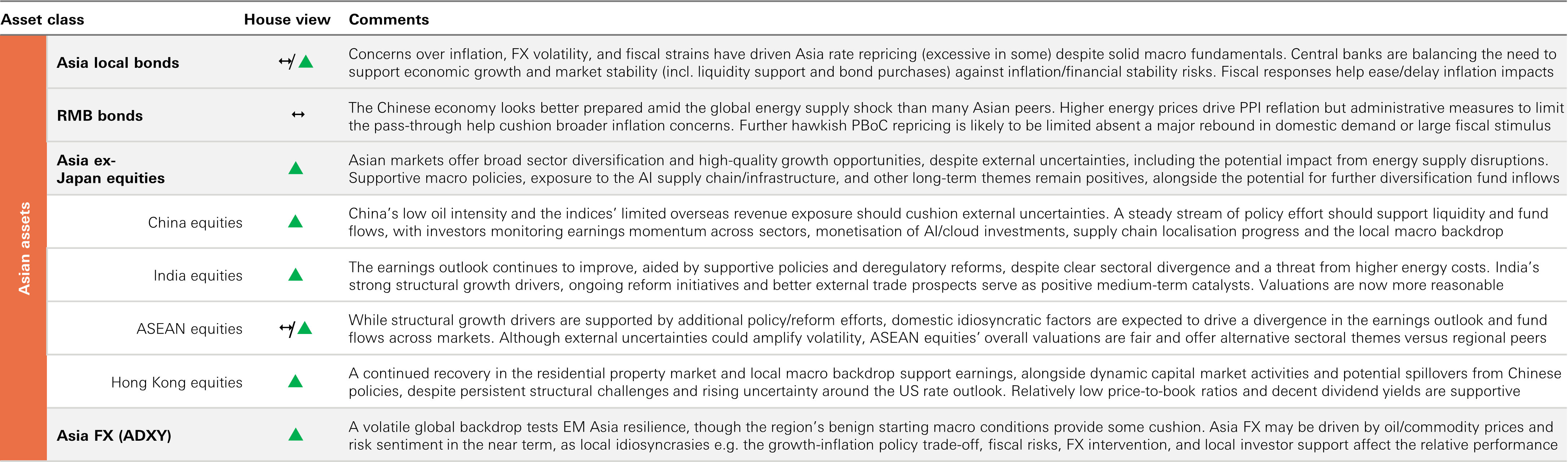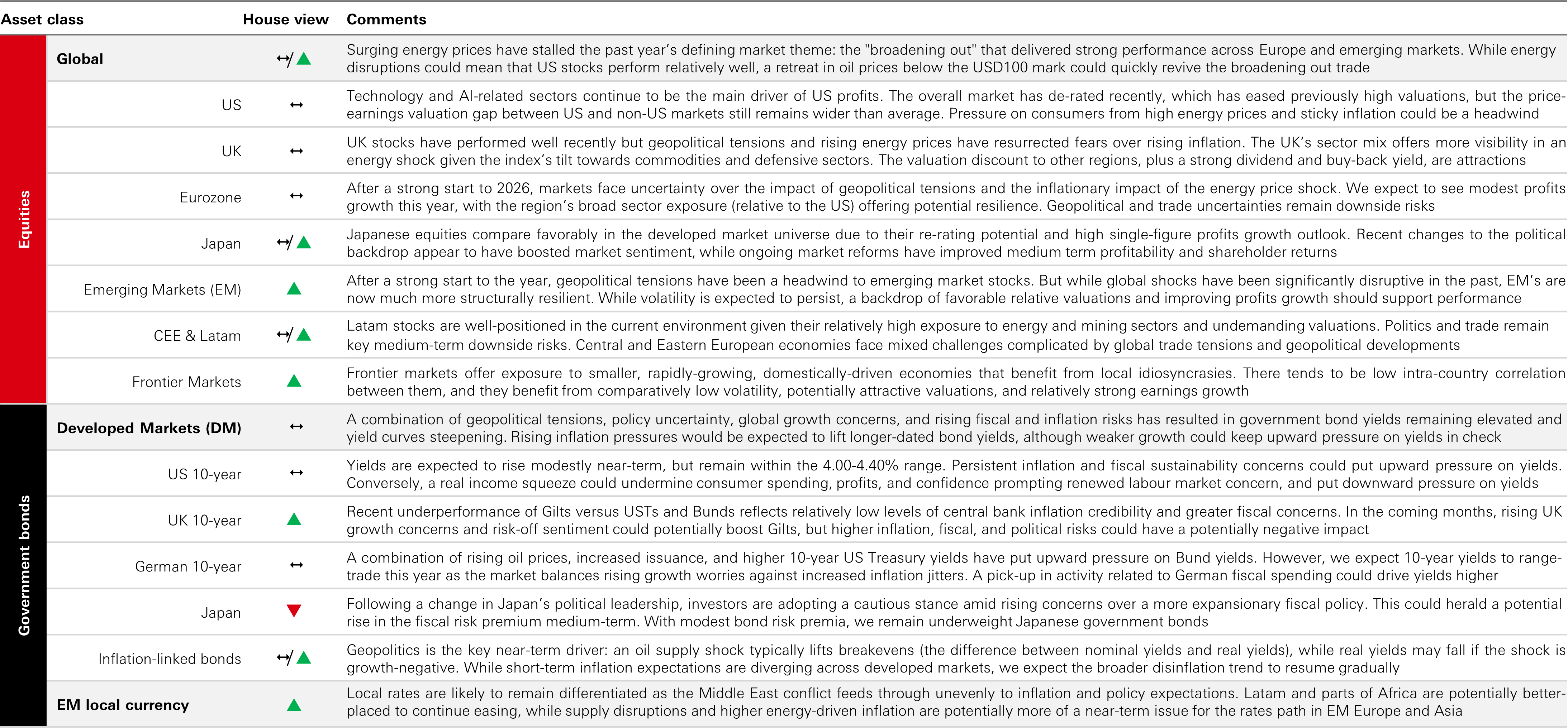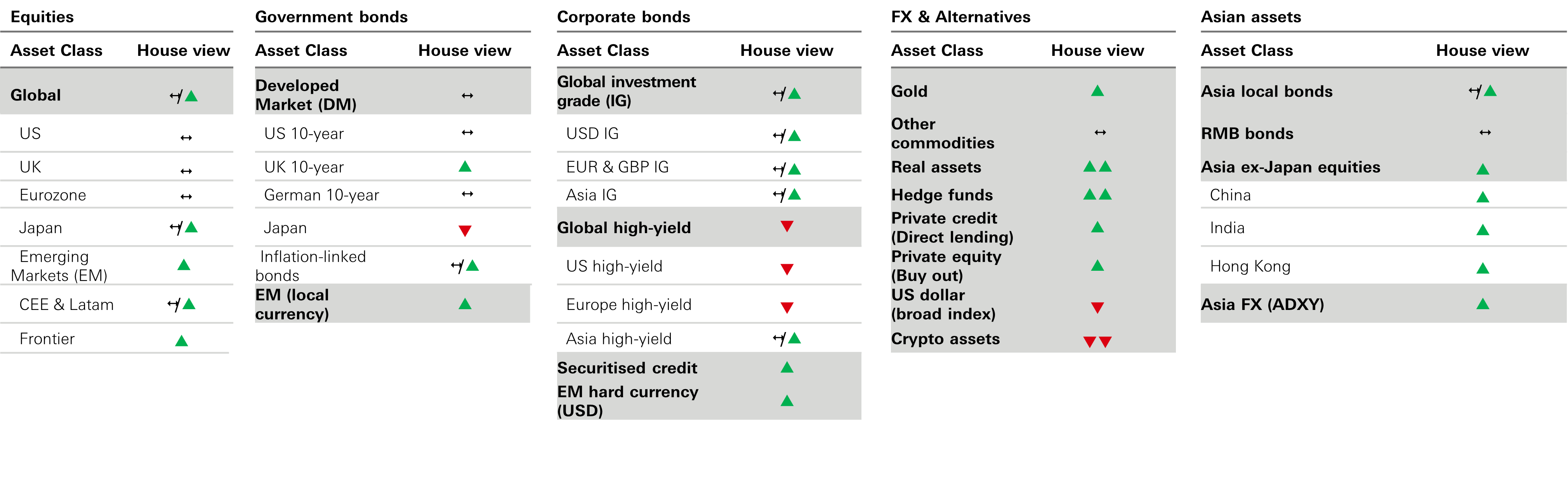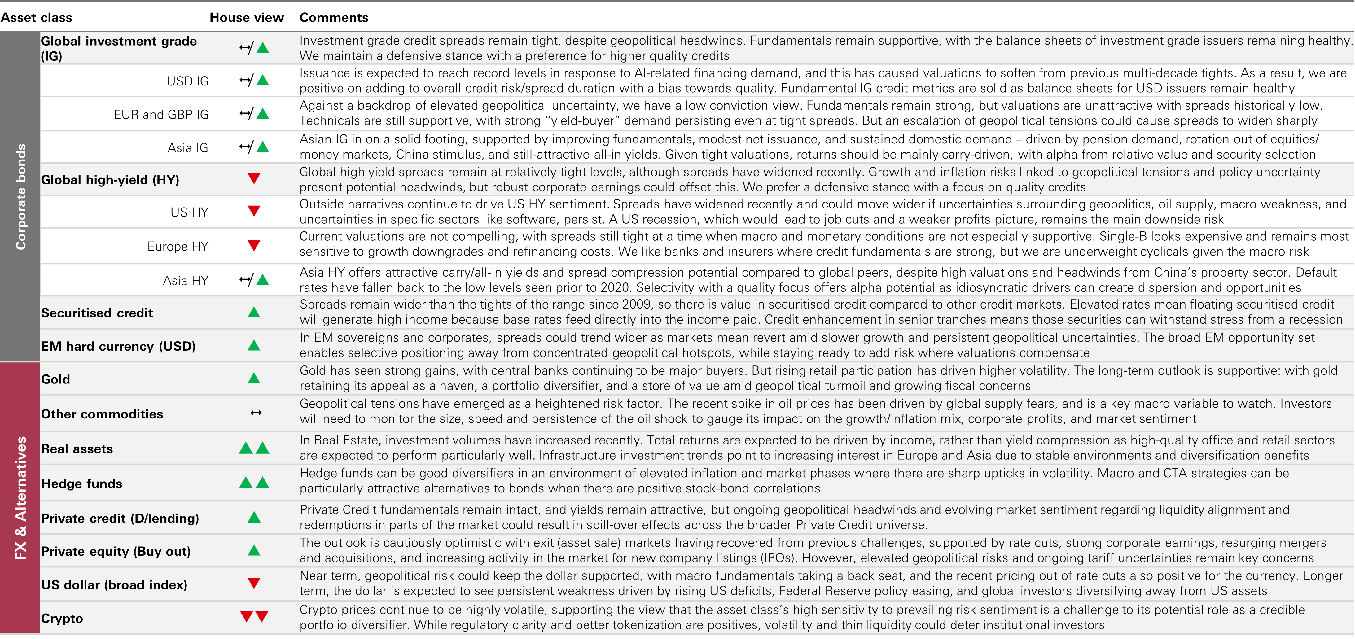 - Icons: ↑ View on this asset class has been upgraded – No change ↓ View on this asset class has been downgraded