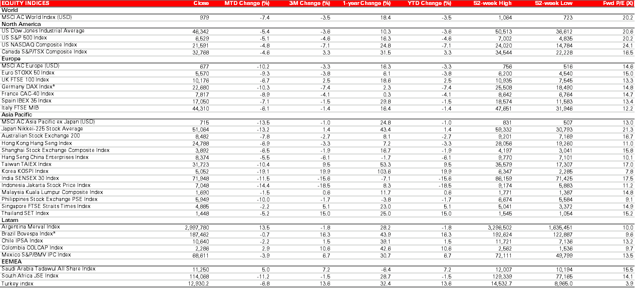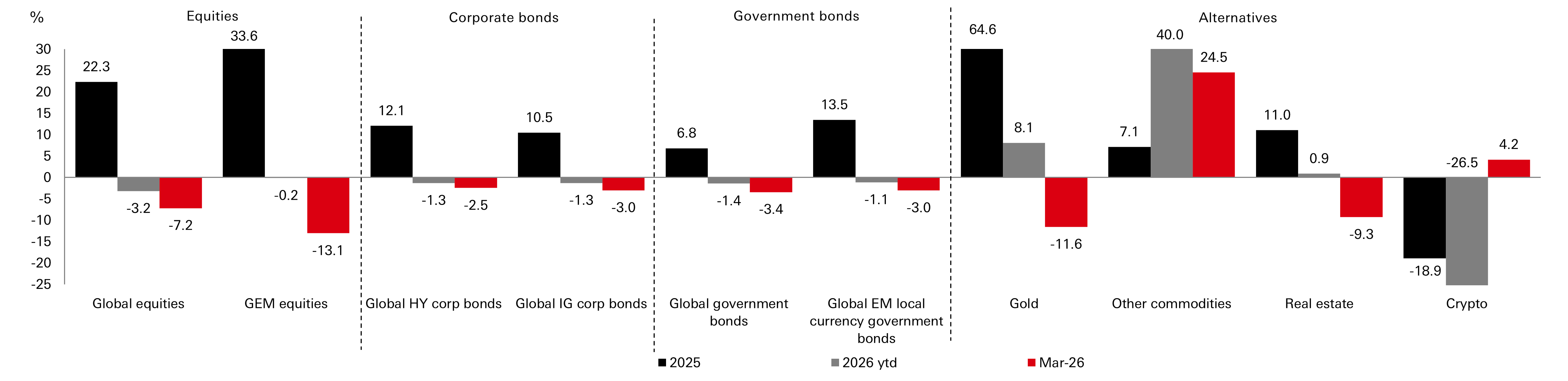 Past performance does not predict future returns. The level of yield is not guaranteed and may rise or fall in the future. This information shouldn’t be considered as a recommendation to invest in the country or sector shown. For informational purposes only and should not be construed as a recommendation to invest in the specific country, product, strategy, sector, or security. The views expressed above were held at the time of preparation and are subject to change without notice. Source: Bloomberg, all data above as at close of business 31 March 2026 in USD, total return, month-to-date terms. Note: Asset class performance is represented by different indices. Global Equities: MSCI ACWI Net Total Return USD Index. Global Emerging Market Equities: MSCI Emerging Market Net Total Return USD Index. Corporate Bonds: Bloomberg Barclays Global HY Total Return Index value unhedged. Bloomberg Barclays Global IG Total Return Index unhedged. Government bonds: Bloomberg Barclays Global Aggregate Treasuries Total Return Index. JP Morgan EMBI Global Total Return local currency. Commodities and real estate: Gold Spot $/OZ, Other commodities: S&P GSCI Total Return CME. Real Estate: FTSE EPRA/NAREIT Global Index TR USD. Crypto: Bloomberg Galaxy Crypto Index. Index returns assume reinvestment of all distributions and do not reflect fees or expenses. You cannot invest directly in an index.