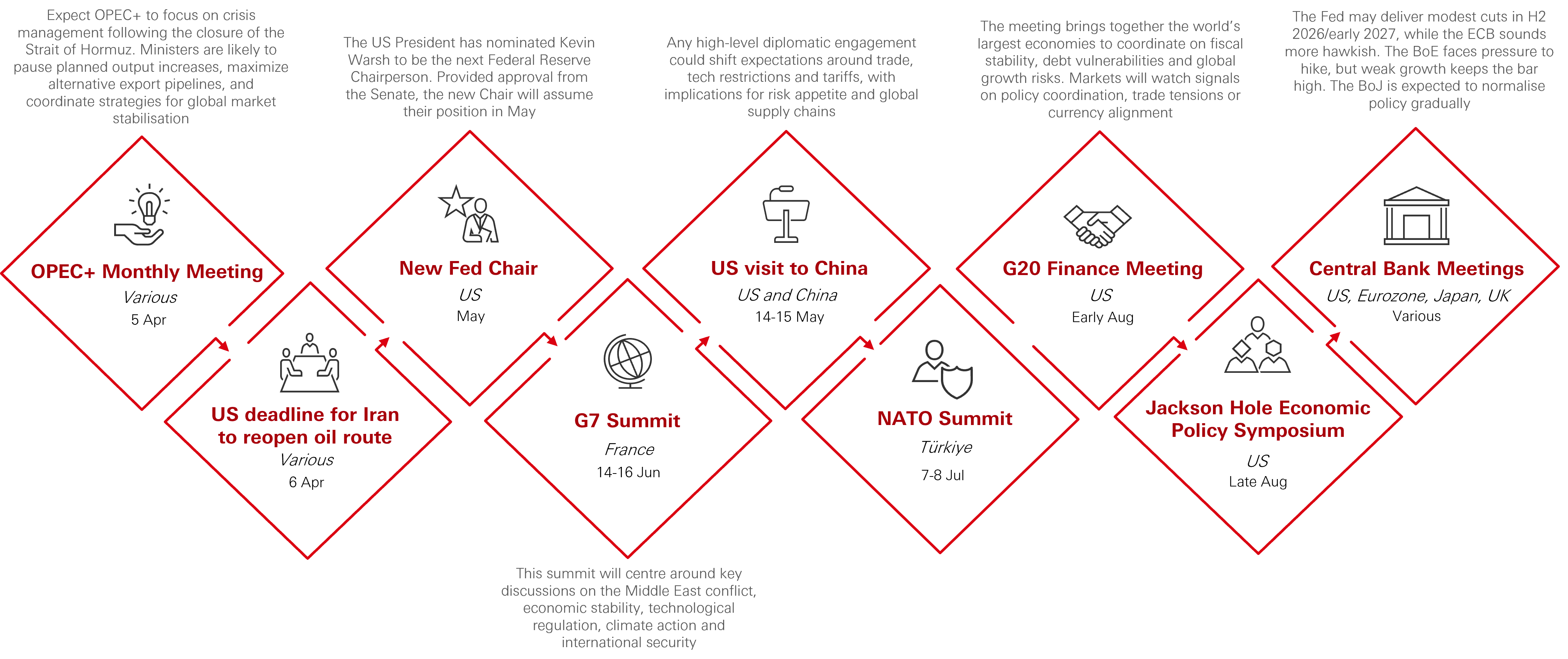 - Geopolitical uncertainty has crystallised into market volatility, with oil and other key commodity prices now the key macro variables to watch