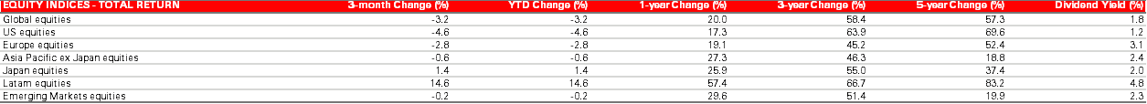 Data sourced from MSCI AC World Total Return Index, MSCI USA Total Return Index, MSCI AC Europe Total Return Index, MSCI AC Asia Pacific ex Japan Total Return Index, MSCI Japan Total Return Index, MSCI Latam Total Return Index and MSCI Emerging Markets Total Return Index.