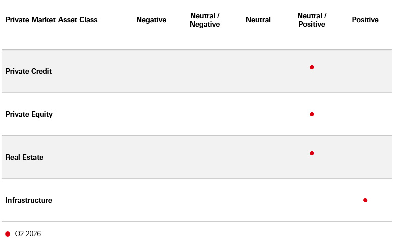 - In Real Estate, we hold a ‘Neutral / Positive’ outlook for the asset class. As investor sentiment has improved, investment volumes increased in 2025, driven by a strong end to the year. Total returns in Real Estate are expected to be driven by income, rather than yield compression as high-quality office and retail sectors are expected to perform particularly well