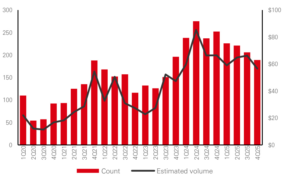 European lenders are steering towards the lower mid-market space, with buyouts also showing a trend toward smaller transactions. Direct lenders funded more than four times as many buyouts than in the broadly syndicated market in the fourth quarter of 2025.