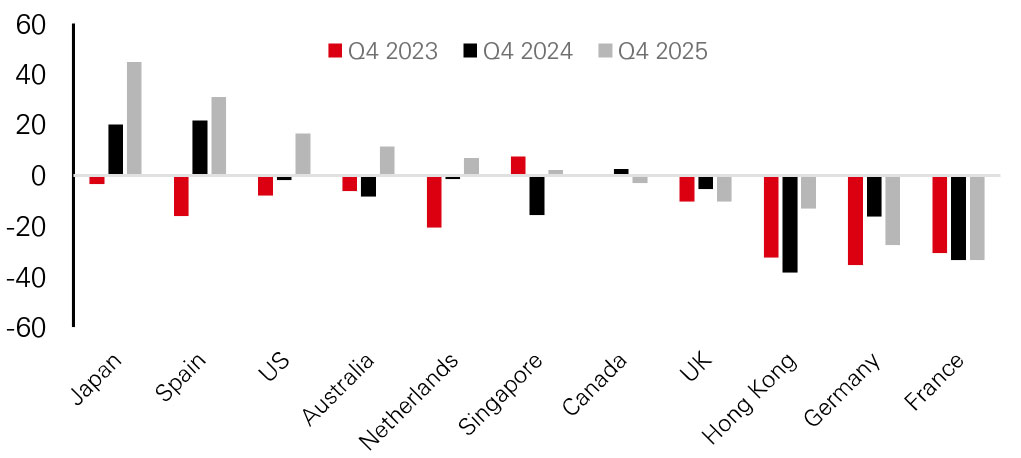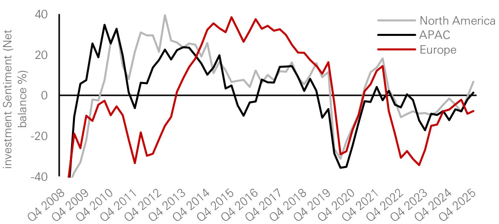 Source: HSBC Alternatives, as of Dec 2025. * The Investment Sentiment Index (ISI) is constructed by taking an unweighted average of net balance readings from three key investment-focused questions: Investment Enquiries, 12-month Capital Value Expectations, Supply of commercial property currently for sale.