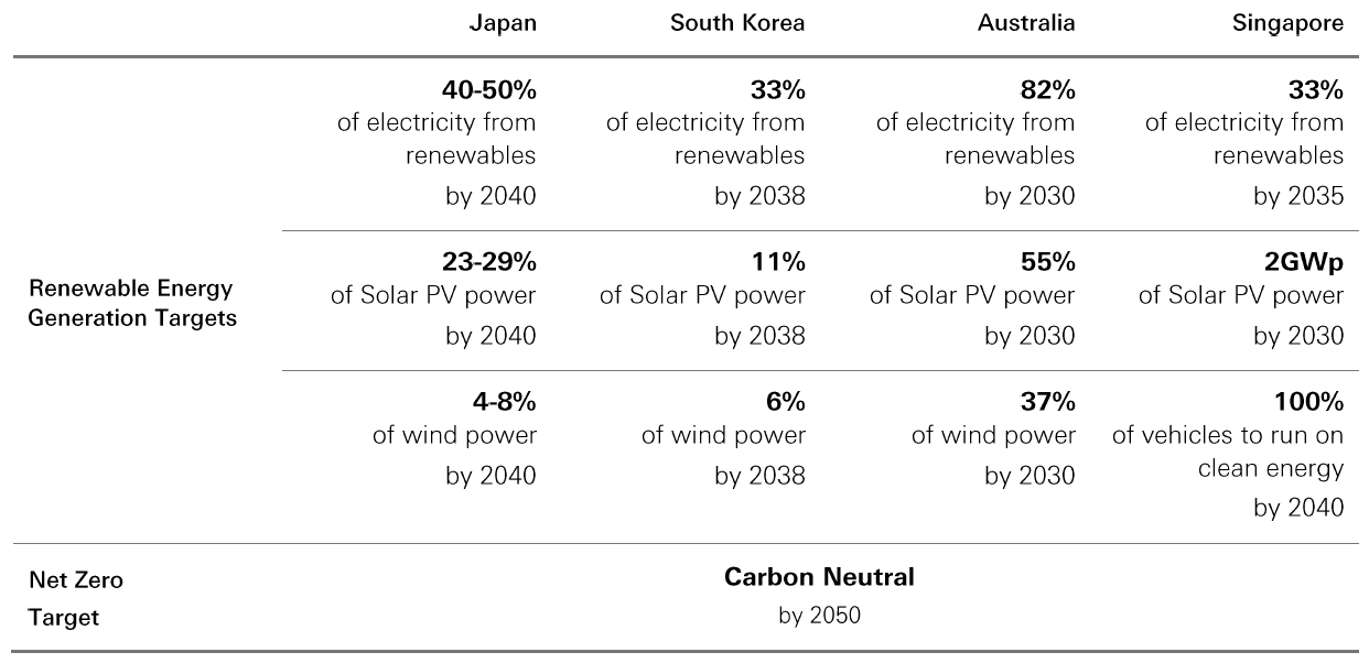 Source: Japan METI: “7th Strategic Energy Plan”; South Korea MOTIE: “11th Basic Plan for Long-Term Electricity Supply and Demand”; Australia Government DCCEEW; Singapore EDB and MND.